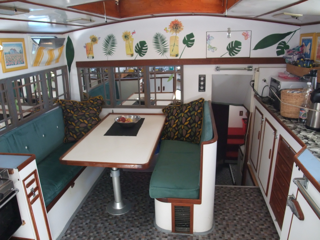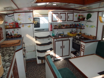 Von der Kombüse aus führt eine Durchreiche in den Decksalon, was das Tisch-Decken und Abräumen sehr erleichtert.